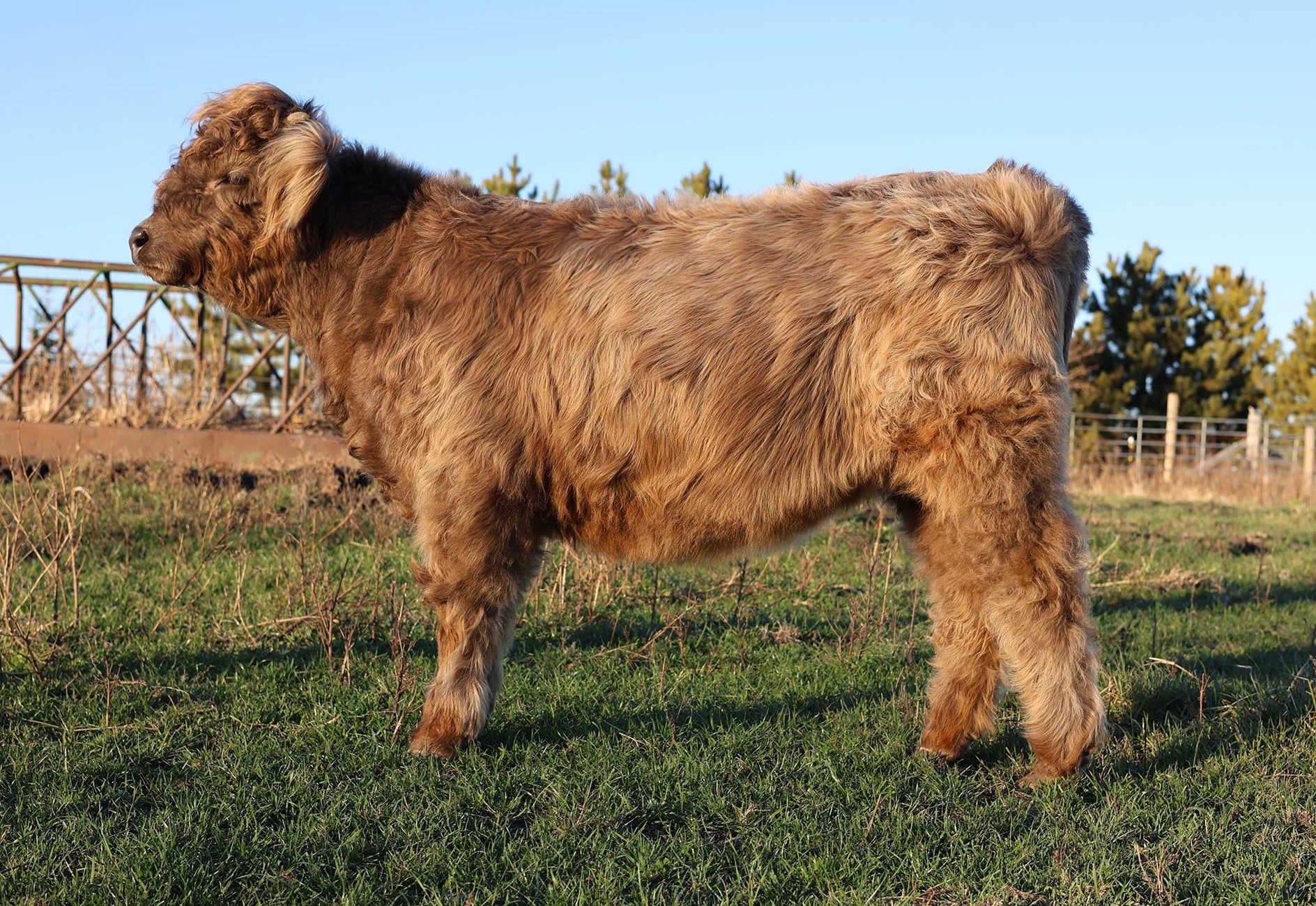 Glen Haven Farms was a powerhouse in show cattle during the early 2000s. They spent a lot of time and energy to find and raise excellent Highland cattle. GH McLintock was no different . As he was the 2008 NWSS Reserve Champion Bull. McLintock is sired by Trafalgar Nathan, the 2006 Grand Champion Bull at the NWSS. Nathan was the maternal sibling to Trafalgar Sampson II, a yellow bull who also sired show-ring winners at Denver too. Further yet, GH McLintock's Grandsire is E Z Acre's Nathaniel, who took home the NWSS Reserve Champion Tittle in 1997, then came back for the Grand Champion Banner in 1998. If his genetics haven't sold you, GH McLintock calves' are known for their easy fleshing and above average growth, all on a nice moderate frame. If you are looking for a colorful bull that produces amazing progeny that are fast growing with heavy muscling this is your guy.